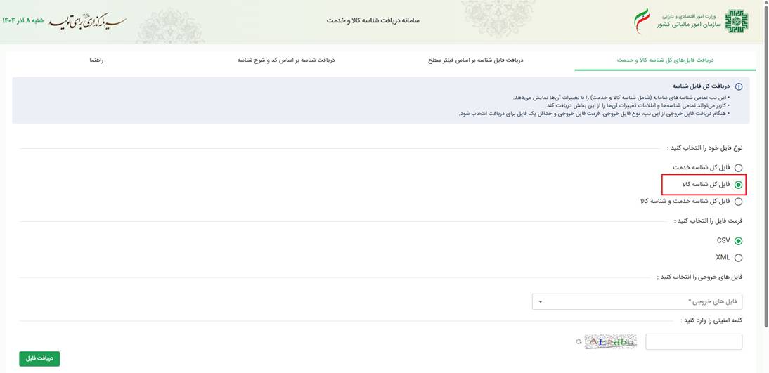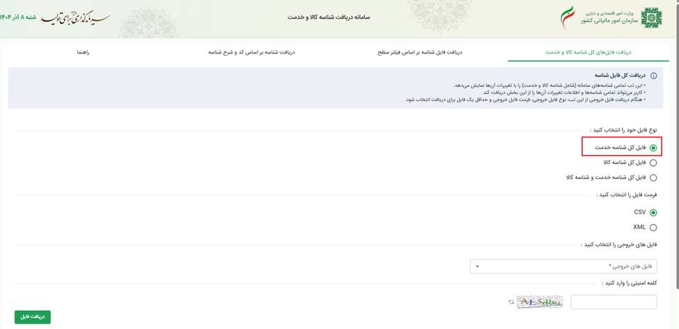 برای دریافت فایل و مشاهده شناسه های خدمت نیز باید در ابتدا وارد سایت stuffid.tax.gov.ir شده و گزینه فایل کل شناسه خدمت را انتخاب کنید.