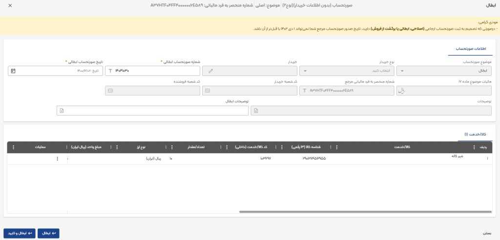 پس از انتخاب گزینه «ابطال»، فیلد شماره صورتحساب، تاریخ صورتحساب و توضیحات ابطال نیازمند تکمیل است. شماره صورتحساب میتواند با شماره صورتحساب اصلی یکسان بوده یا به صورت متفاوت ثبت شود.