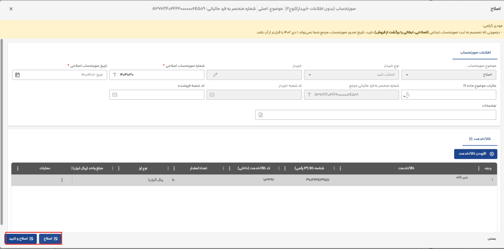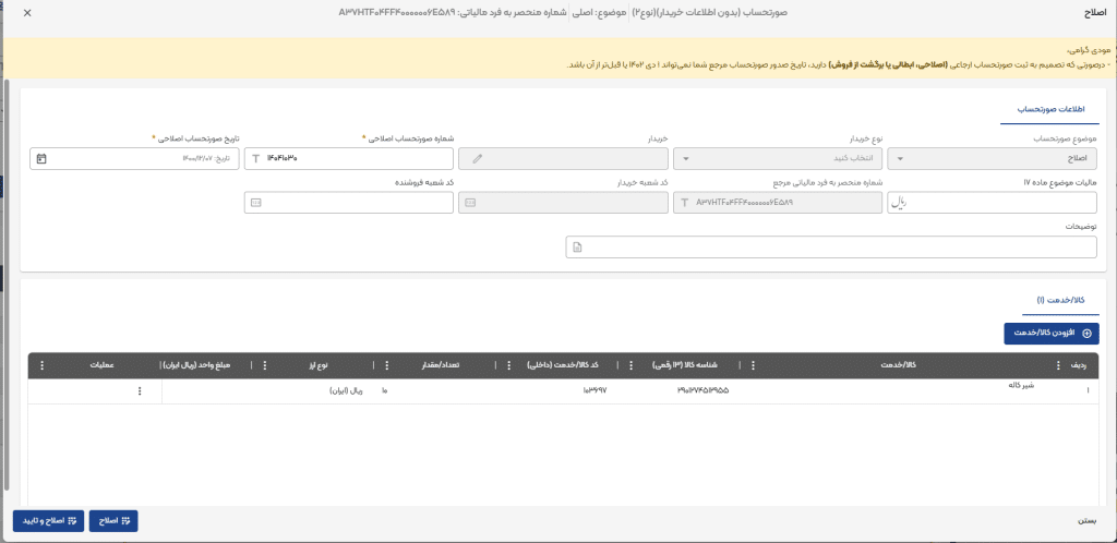 درصورتی که مایل به اصلاح تغییراتی در اطلاعات هویتی خریدار یا شناسه کالا/خدمت در صورتحساب هستید، امکان اصلاح وجود ندارد. دراین شرایط، باید اقدام به ثبت صورتحساب ابطالی نمایید.