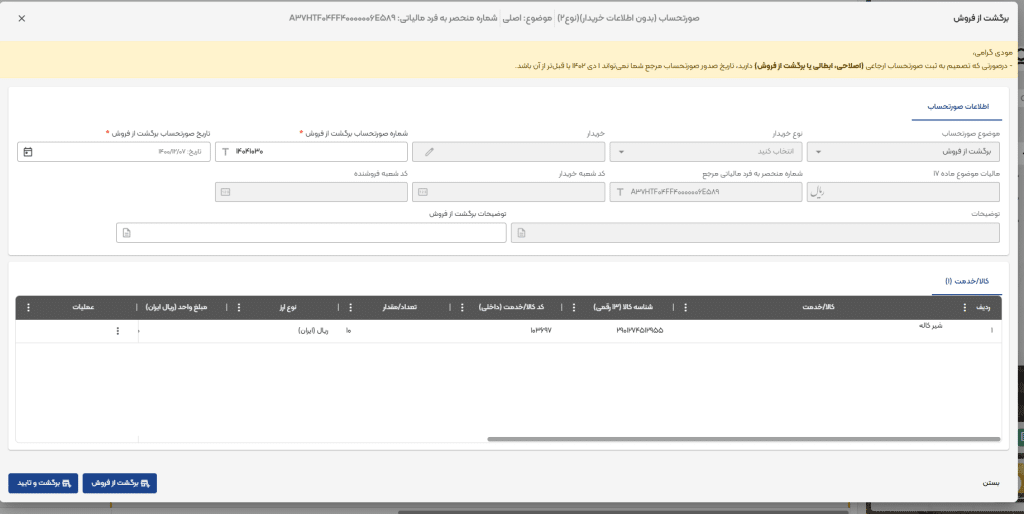در ثبت صورتحساب برگشت از فروش، فیلد تعداد/مقدار باید براساس تعداد/مقدار باقیمانده نزد خریدار ثبت شود.