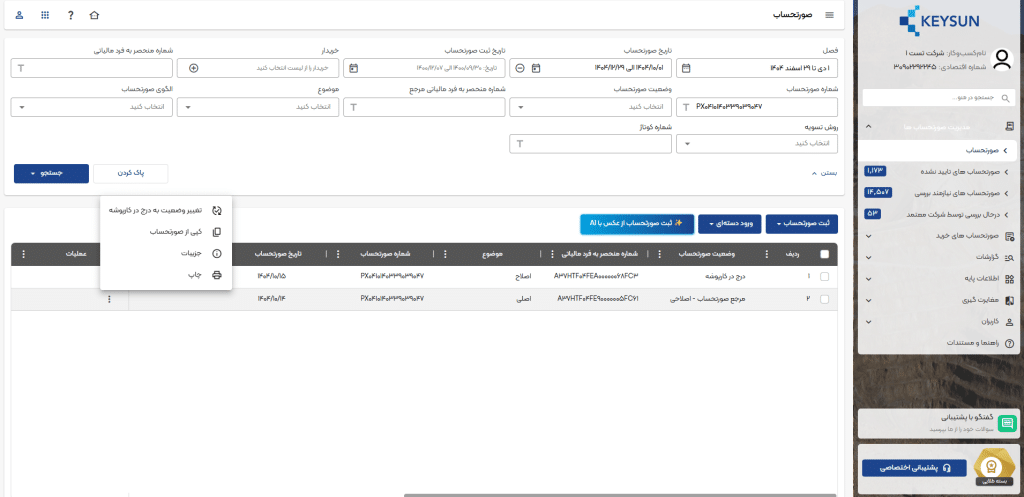 با استفاده از عملیات تغییر وضعیت به «درج در کارپوشه»، ثبت صورتحساب ارجاعی مجدد روی صورتحساب مرجع امکان پذیر است.