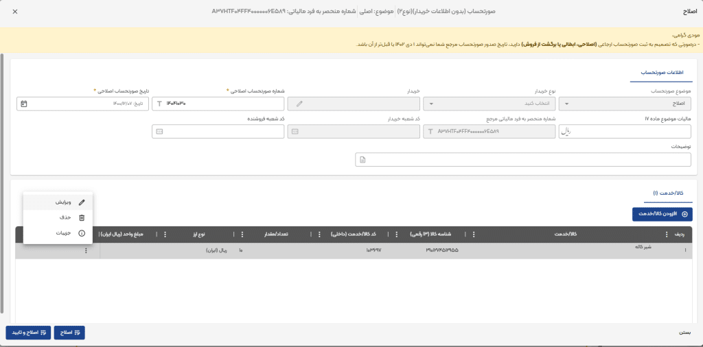 پس از ثبت فیلدهای الزامی در بخش سرآمد صورتحساب، گزینه «ویرایش کالا/خدمت» را از منوی عملیات هر ردیف انتخاب نمایید تا امکان ویرایش یا حذف اطلاعات کالا/خدمت فراهم شود.