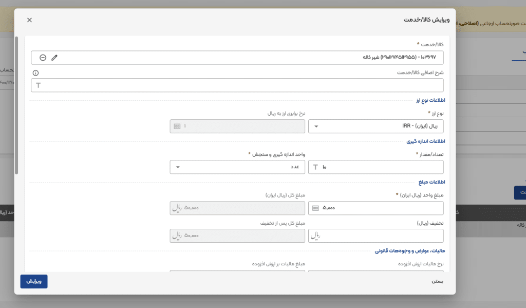 اطلاعات دیگر مربوط به صورتحساب مانند تعداد، واحد اندازه گیری و سنجش، نوع ارز، تخفیف، نرخ برابری ارز با ریال، مبلغ واحد قابل اصلاح است.