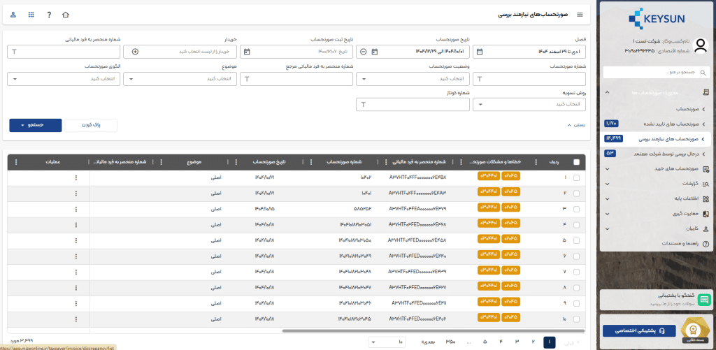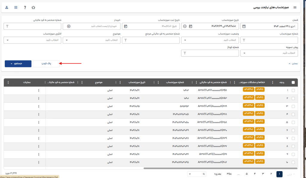 - درصورتی که خطایی با عنوان «شماره مالیاتی معتبر نیست» نمایش داده شود، میتوان اقدام به حذف صورتحساب نیازمند بررسی نموده و مجدد ثبت انجام شود.