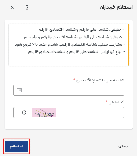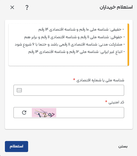 نکته: درصورتی که خریدار دارای پرونده مشارکت مدنی است، شماره اقتصادی خریدار که با «6» آغاز میشود وارد شده و استعلام با کدملی امکان پذیر نیست.