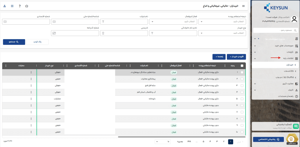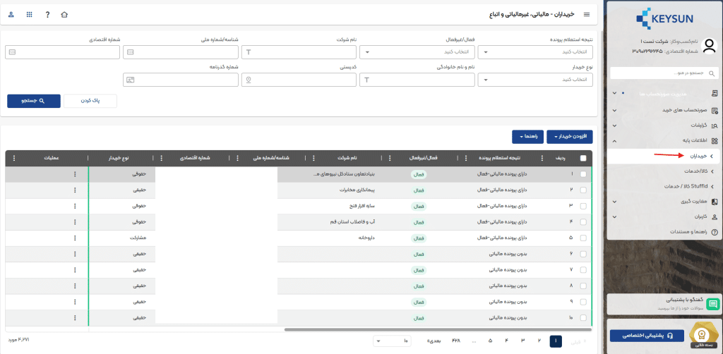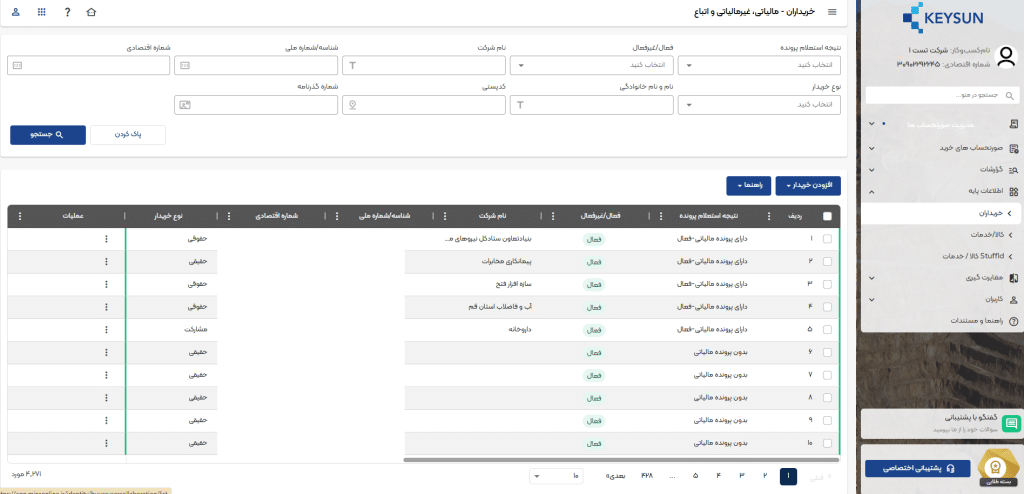 در صدر این لیست میتوانید نام شرکت، شناسه ملی/کدملی، کد اقتصادی، نوع خریدار، نام خانوادگی، کد پستی، شماره همراه، وضعیت فعال یا غیرفعال بودن، نتیجه استعلام پرونده، عملیات خریداران موجود در لیست را مشاهده کنید .