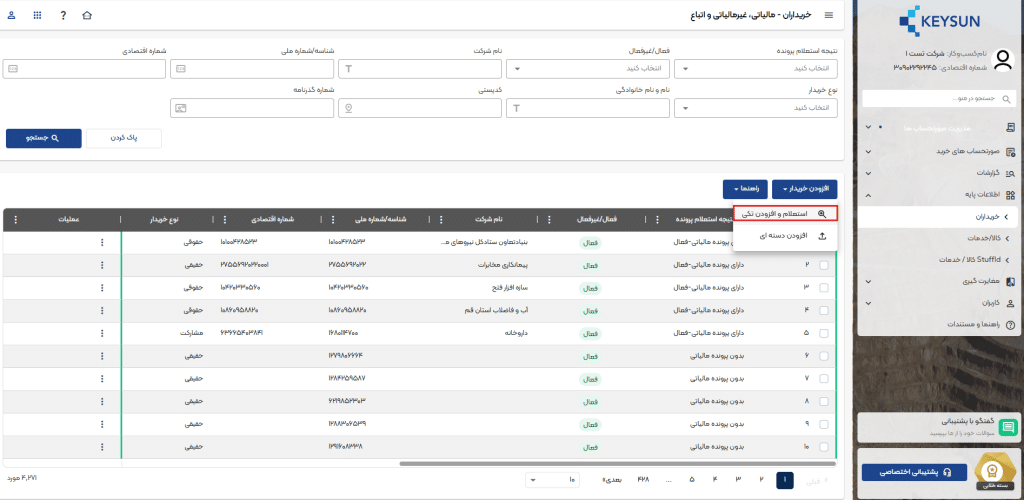 برای ثبت و یا استعلام خریدار باید در ابتدا از بخش «خریداران»، گزینه «افزودن خریدار»، سپس «استعلام و افزودن تکی خریدار» را انتخاب کنید.