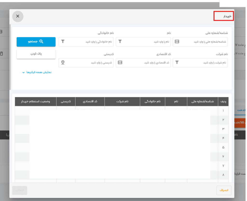 خریدار (مالیاتی/ غیرمالیاتی): میتوانید در این لیست، خریدارن مالیاتی خود را مطابق تصویر 6 مشاهده کرده و با امکان جستجو، خریدار موردنظر خود را بیابید.