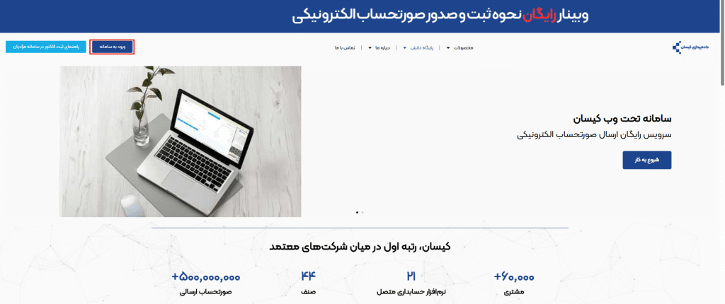 برای ورود به حساب کاربری خود در «پایانه فروشگاهی کیسان»، ابتدا وارد آدرس keysuntsp.com شده و گزینه «ورود به سامانه» را مطابق تصویر انتخاب کنید.