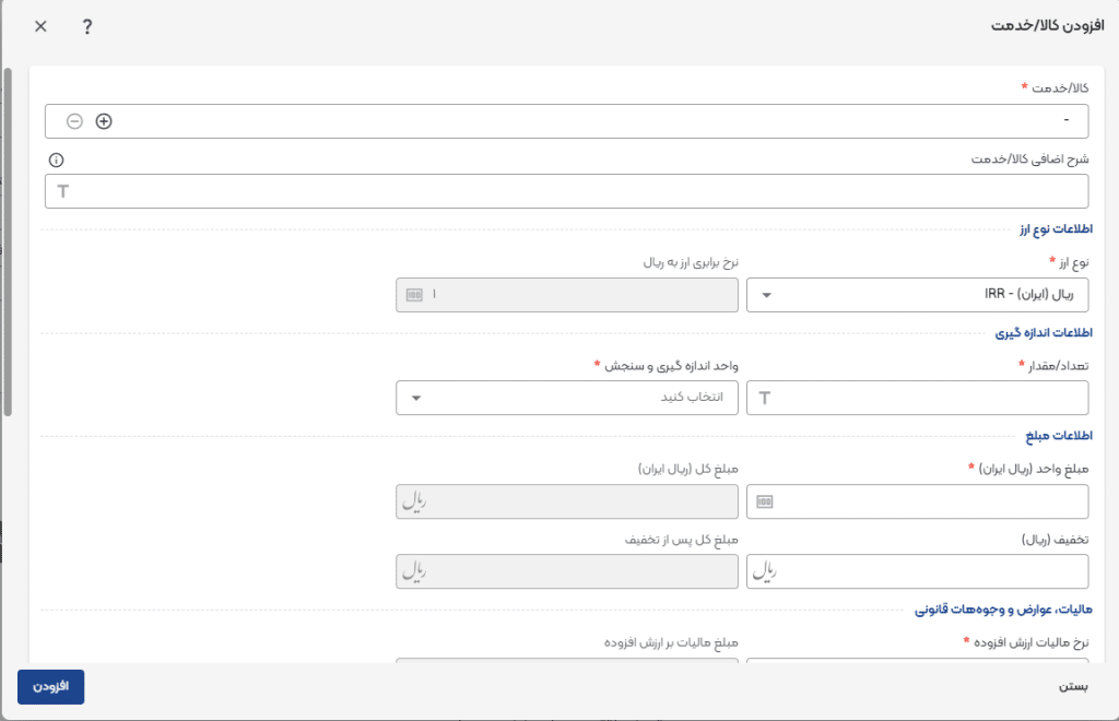 مبلغ مالیات بر ارزش افزوده: مقدار این فیلد بر حسب مبلغ کل و درصد مالیات بر ارزش افزوده محاسبه میشود.