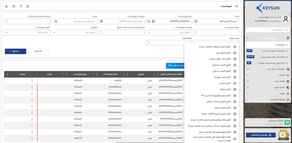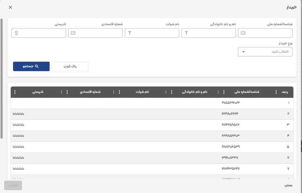خریدار (مالیاتی/ غیرمالیاتی): میتوانید در این لیست، خریداران مالیاتی خود را مطابق تصویر مشاهده کرده و با امکان جستجو، خریدار موردنظر خود را بیابید.