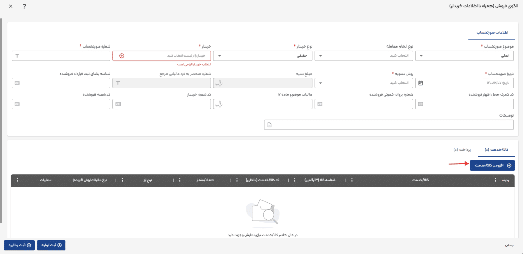 نکته! برای انتخاب خریدار، باید نوع خریدار در ابتدای ثبت صورتحساب تعیین شده باشد تا گزینه «+» فعال شود.