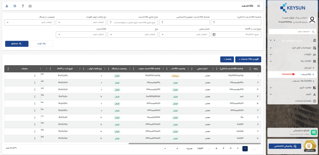 اعتبارسنجی: در این قسمت با انتخاب گزینه معتبر، تمامی مواردی را که stuffid بوده و مورد تایید است، مشاهده میکنید و در صورتی که شناسه شما قبل از تعریف شدن در لیست کالا/خدمات اضافه شده باشد، با انتخاب گزینه نامعتبر قابل رویت خواهد بود.