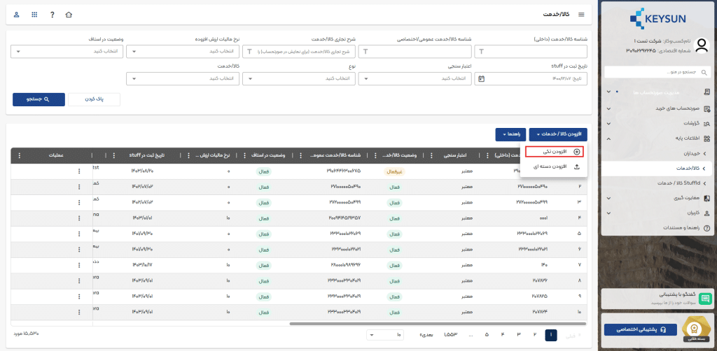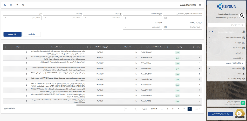 همچنین از بخش اطلاعات پایه، گزینه «کالا/خدماتstuffid» در «سامانه تحت وب کیسان» میتوانید شناسههای موجود در سامانه شناسه کالا خدمت را جستجو و دریافت کنید.