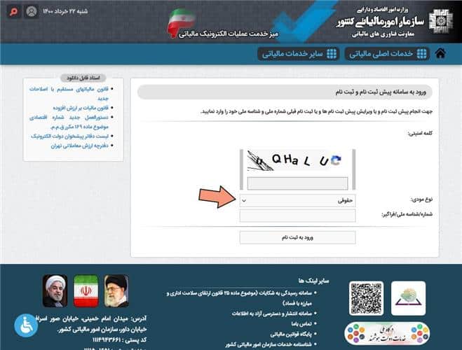 پس از ورود عبارت امنیتی نمایش داده در کادر مربوطه، «نوع مودی» را به «حقوقی» تغییر داده سپس «شناسه ملی/فراگیر» خود را وارد نمایید و بر روی دکمه «ورود به ثبت نام» کلیک کنید.